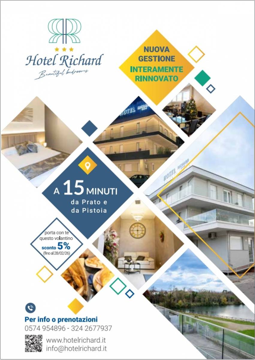 Hotel Richard, located at Via Papa Giovanni XXIII 11 in Agliana (near Pertini Park), was completely renovated and refurbished in 2025 to offer 22 modern and welcoming rooms, all with en-suite bathrooms, satellite TV, and fast Wi-Fi. It also features free parking and a breakfast room, perfect for your business or leisure stay.